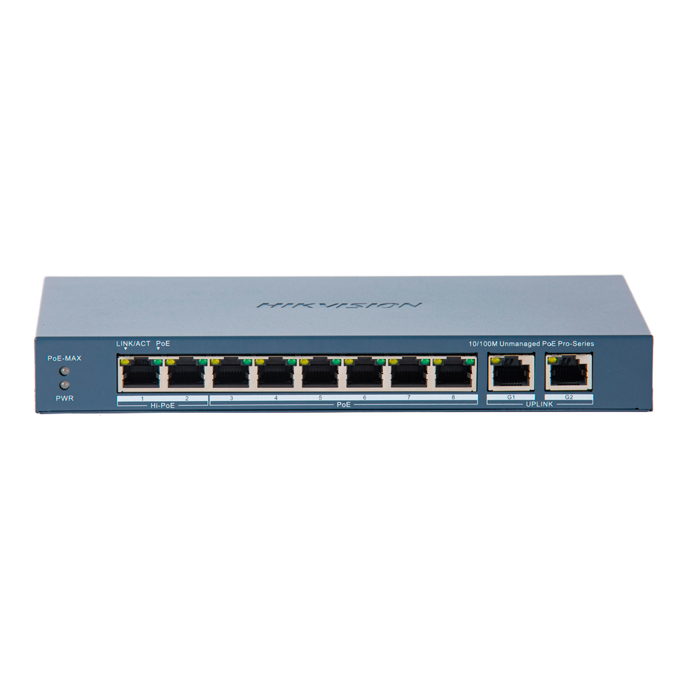 De Hikvision DS-3E0310HP-E(C) is een onbeheerde PoE-switch met 10 poorten, ontworpen om connectiviteit en stroom te leveren aan apparaten zoals IP-camera's, Wi-Fi-toegangspunten en VoIP-telefoons. Dit model beschikt over acht PoE-poorten (Power over Ethernet) die de IEEE 802.3af/at-standaard ondersteunen, waardoor zowel data als stroom via dezelfde Ethernetkabel kunnen worden verzonden. De switch heeft een totaal PoE-vermogen van 130 W, wat voldoende is om meerdere PoE-apparaten tegelijkertijd van stroom te voorzien zonder dat extra voedingsinjectoren nodig zijn.